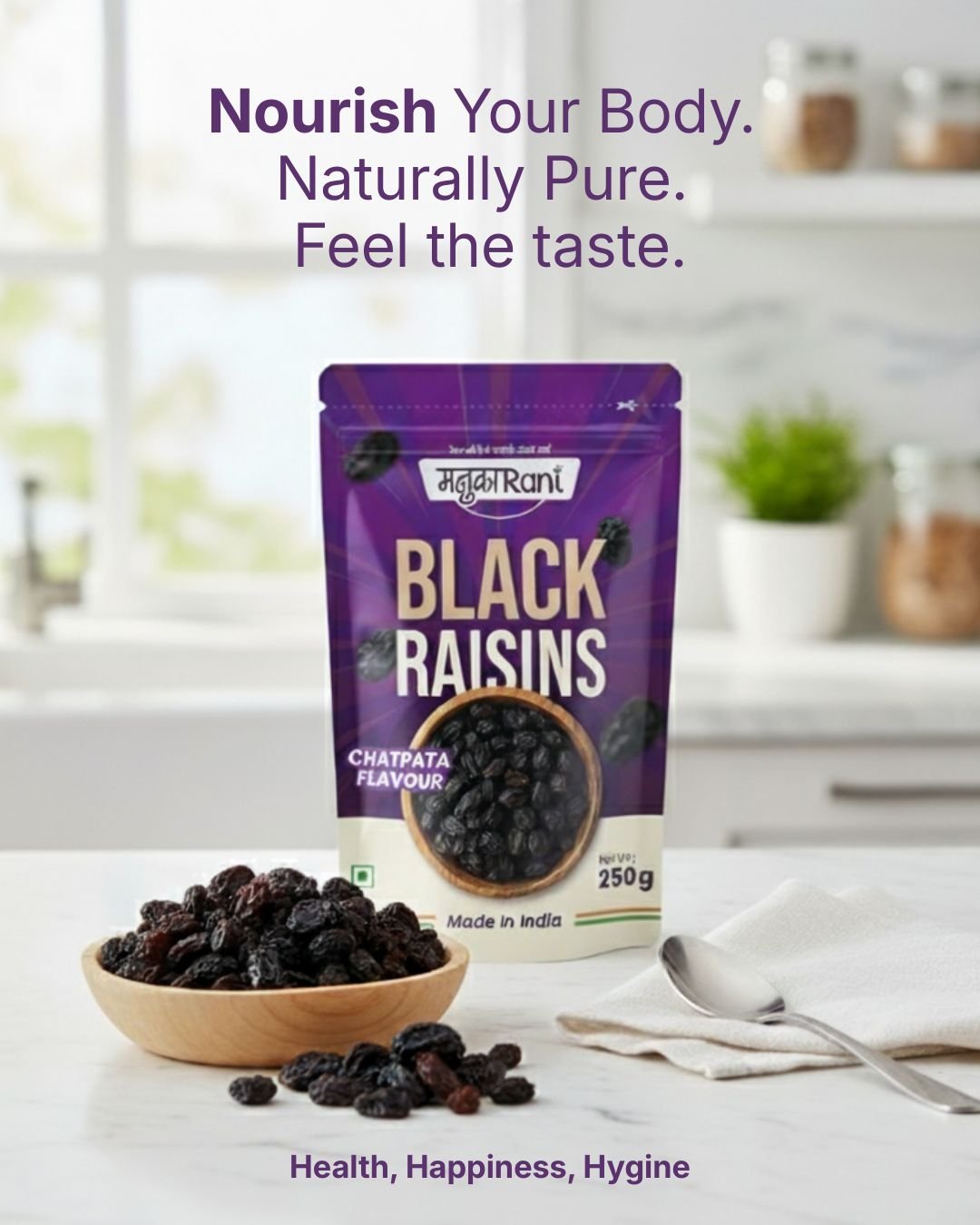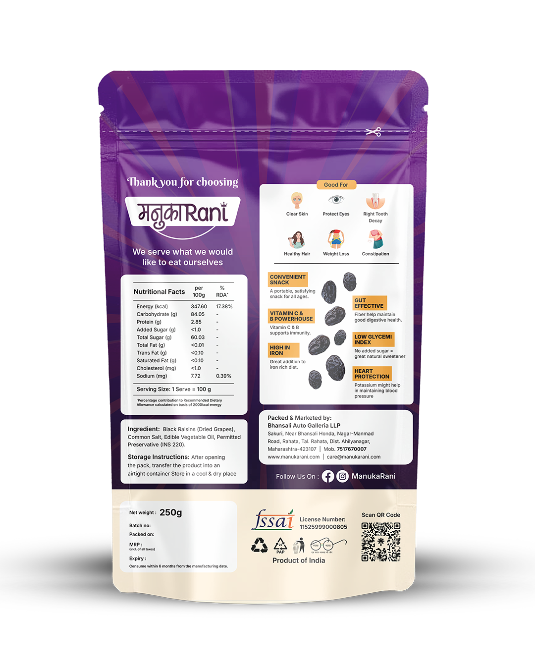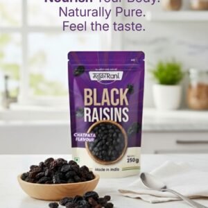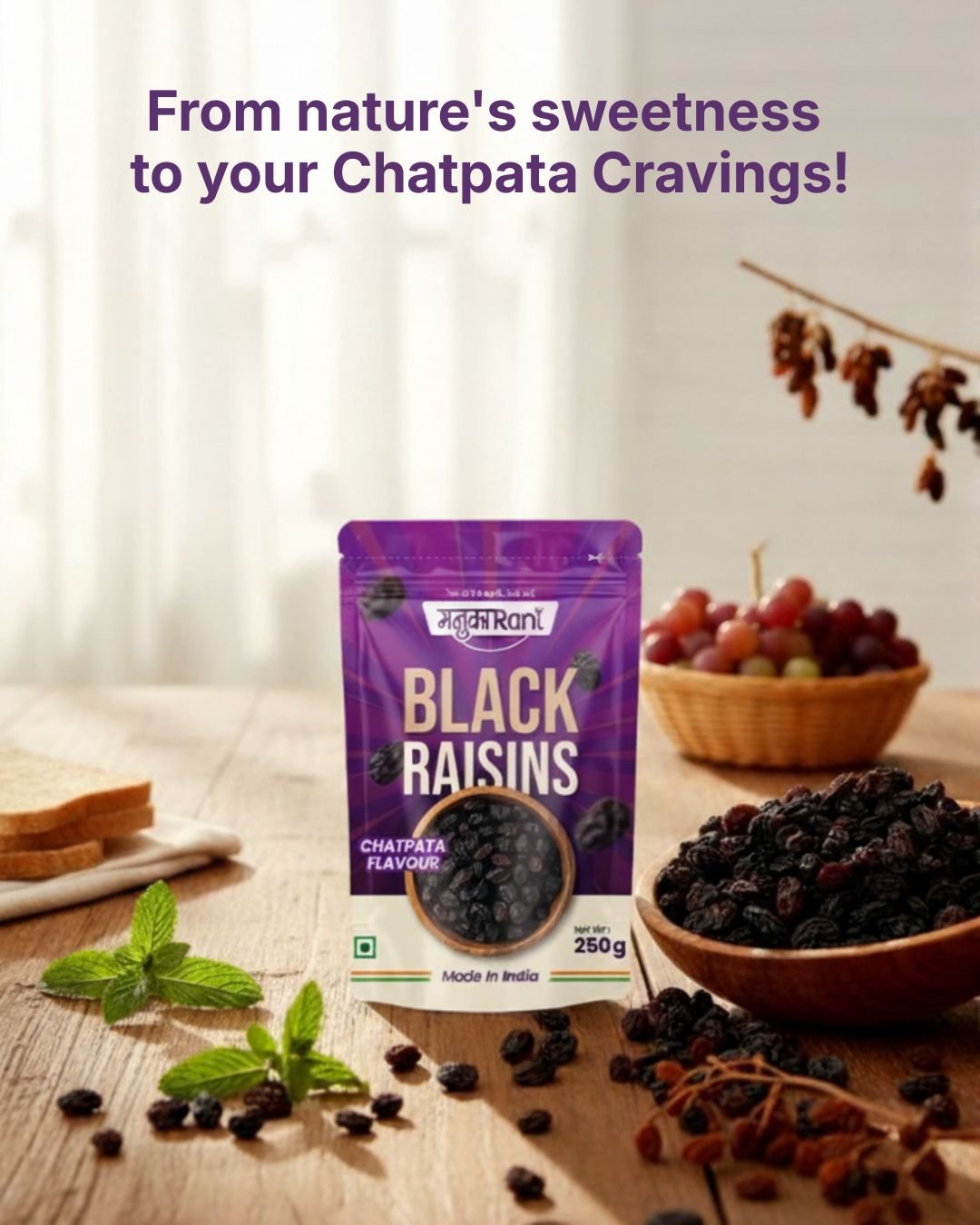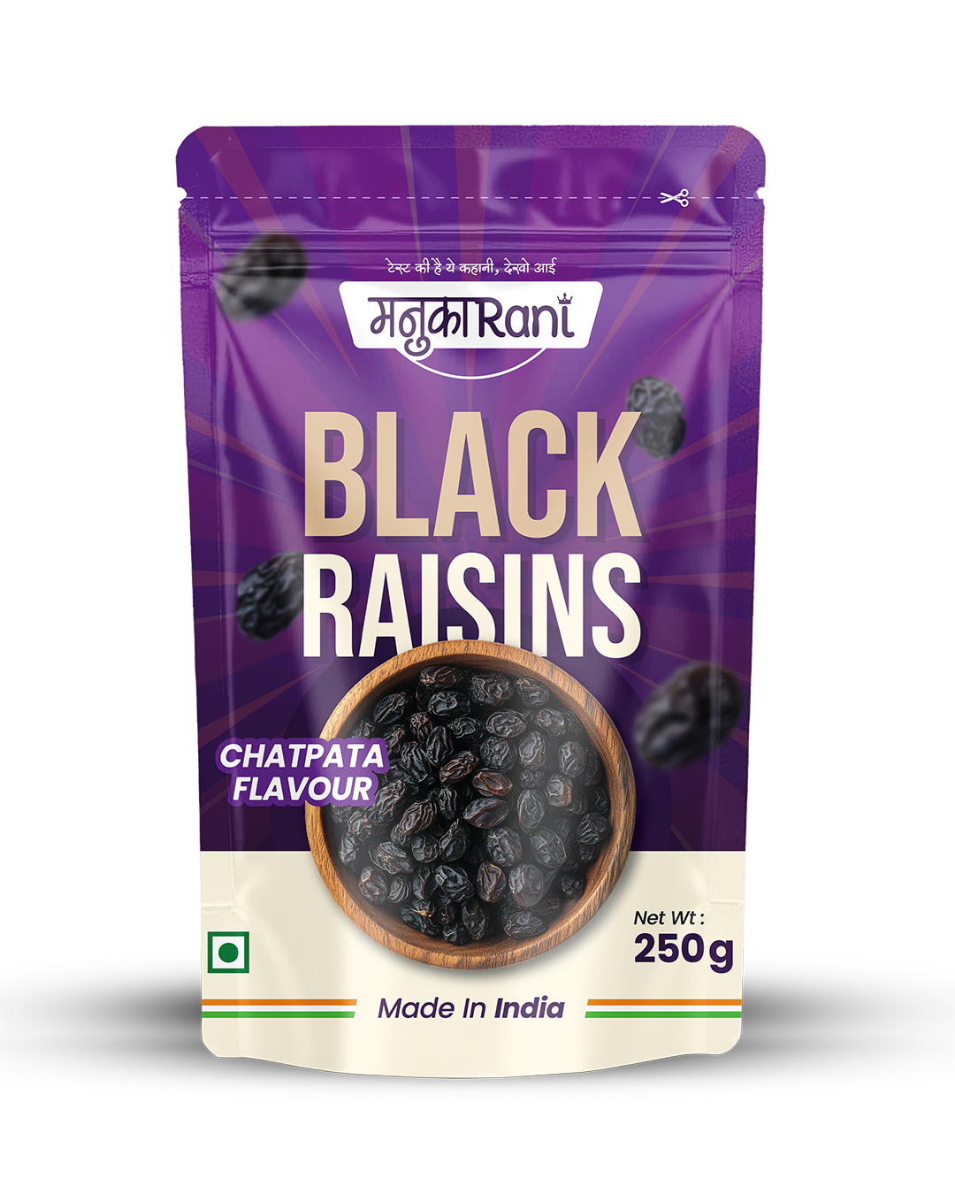 Enjoy the perfect blend of health and flavour with Manuka Rani’s chatpata black raisins. Made from premium, handpicked raisins, they offer natural sweetness with a tangy-spicy kick. Rich in antioxidants and nutrients, it’s the ideal anytime snack—tasty, healthy, and absolutely irresistible!